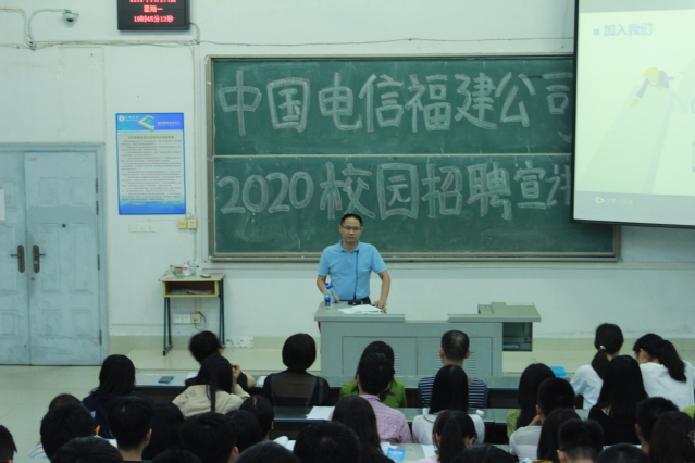 为给即将步入社会的2020届毕业生提供更多的就业机会,增强毕业生就业信心,提升毕业生服务地方意识。10月14日晚,9001cc金沙以诚为本邀请了中国电信三明分公司来校举办招聘宣讲会,宣讲会地点位于鸿文楼101,9001cc金沙以诚为本、艺术与设计学院、经济与管理学院毕业生参加了宣讲会。