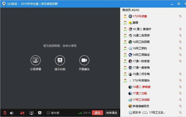 为贯彻落实习近平总书记关于全国疫情防控的重要指示精神和中央、省市党委、校党委的相关决策部署,3月9日20:00,信息工程学院学生第二党支部以QQ语音会议的形式,居家开展了“我是党员我承诺,积极防疫我在做”为主题的线上党员之声活动。参与本次活动的党员共40人。