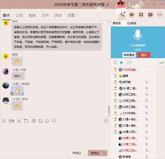 3月18日晚上,9001cc金沙以诚为本学生第二党支部以QQ语音会议的形式,居家开展了“严明规矩,齐心战疫”为主题的线上党日活动。参与本次活动的党员共41人。