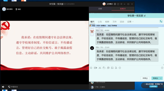 活动开始,薛雁绒同志向大家展示了一些看似很科学的谣言及造谣者被处罚的案例,呼吁大家要学会区分,懂得求证,莫让谣言成“真理”。接下来薛雁绒同志以抗击疫情期间个别大学生谎报瞒报个人行踪、缺课旷课、不服从管理最终“自食苦果”为例,教育警示全体学生党员要引以为戒,主动遵守学校相关纪律要求。最后,薛雁绒同志带领大家宣誓,在疫情期间自觉遵守社会法律法规,自觉遵守学校规章制度,不轻信谣言,不传播谣言,管理好自己的社交帐号,敢于揭露虚假信息、主动辟谣,共同维护公共网络秩序。