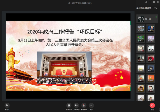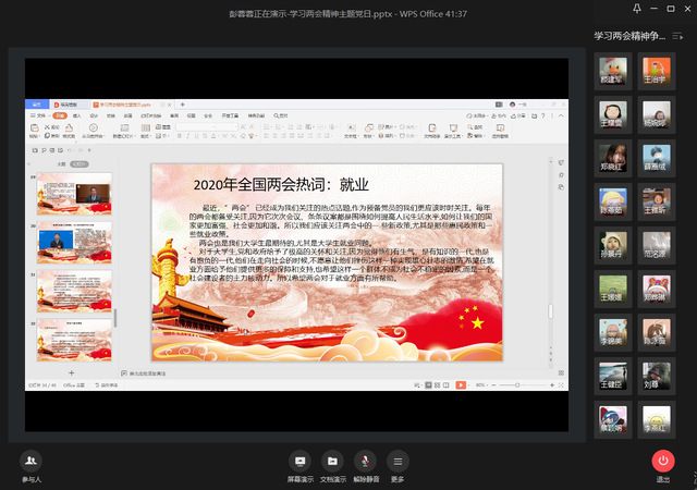 大会伊始,凑唱国歌,全体成员奏唱国歌,铿锵有力的国歌将大家相隔千里的心凝聚在一起,紧接着由学生第一党支部书记介绍两会的背景知识,让同学们对两会精神有了更深入的了解,随后,支部书记带领大家一起回顾全民抗疫的点点滴滴,介绍了钟南山和李兰娟院士等人的战疫英雄事迹,向学生党员展示了在对战疫情的时候我们党坚定不移的决心和意志,感动和鼓舞了每一位学生党员的内心。接下来俞一诺和彭蓉蓉同志分别向大家讲解了两会中大家关注的环保以及大学生就业问题,俞一诺同志表示希望作为学生党员的我们要带领大家保护身边环境,共同守护蓝天白云,彭蓉蓉号召学生党员要发挥先锋模范作用,比如大学生党员支援西部和乡村建设等等,将我们的理想同祖国结合在一起,让青春更加有意义,学生党员们积极发言,分享了在两会之后的感想。最后,院党委书记颜书记对本次活动进行总结,升华主题的同时,再次强调我们作为学生党员的我们要做好先锋模范的带头作用,尤其是现在疫情期间,遵守国家规定,服从学校安排,全员一心,将两会所传达的伟大精神内涵赋予日常生活的点滴之中。