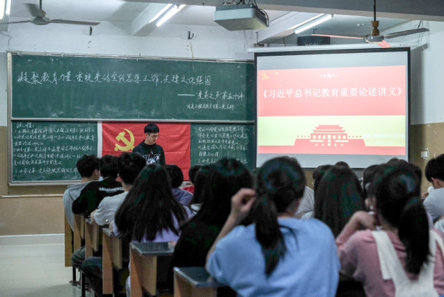 活动伊始,主持人开篇演讲引入主题,并介绍了《论党的宣传思想工作》与《习近平总书记教育重要论述讲义》的相关知识。接着,由学生第二党支部苏益楚同志带领大家深入学习了《习近平总书记教育重要论述讲义》,认识教育是提高人民综合素质、促进人的全面发展的重要途径,是民族振兴、社会进步的重要基石,是对中华民族伟大复兴具有决定性意义的事业。随后,学生第一党支部张思琦同志与大家学习研讨了《论党的宣传思想工作》,体会了党的宣传思想工作对提高国家软实力具有重要意义。其中,学生党员们分享了自己的感想以及未来奋斗的思想目标。最后,党支部书记赵佳慧同志针对此次活动进行总结,就学生党员在这百年未有之大变局中要向上向善,以学在前、做表率的实际行动,营造风清气正的和谐校园环境。