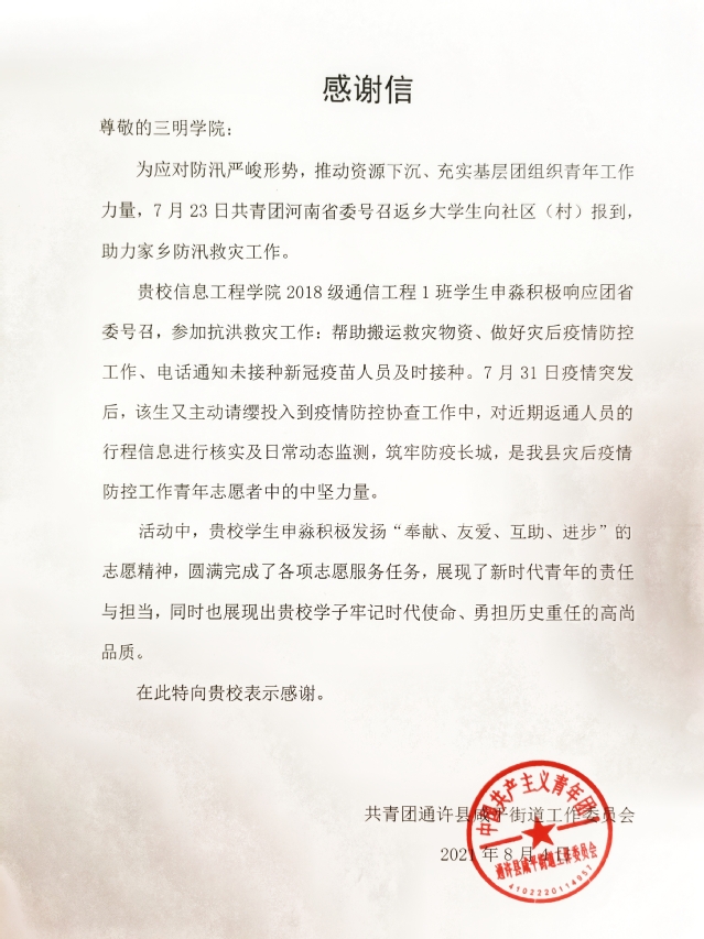 通许县咸平街道团工委在活动结束后发来感谢信,对我校学生党员志愿者在抗洪救灾、疫情防控工作中的突出表现给予高度肯定,赞许我校学子牢记时代使命、勇担历史重任的高尚品质。