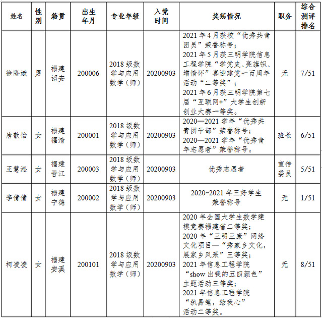 经9001cc金沙以诚为本数学与应用数学专业学生党支部讨论,徐隆斌等5位同志预备期满,现将其简况予以公示,公示时间从2021年9月6日至9月10日(5天)。如有异议,请于上述时间向所在党委反映。接待来访地点及联系电话:13860579133(院党委组织员李扬帆),来信请投入“公示意见箱” :科技楼611党委办公室(地点)。