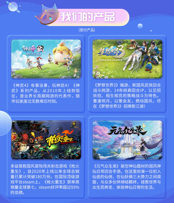 多益网络成立于2006年,是中国优秀的自主研发和自主运营的互联网游戏企业,旗下业务涵盖网络游戏、电子邮箱、即时通讯等互联网产品,已推出“梦想世界”系列和“神武”系列在内的多款精品游戏。多益网络是国家科技部认定的高新技术企业、广州市认定的总部企业。