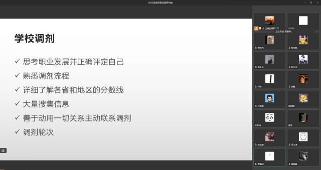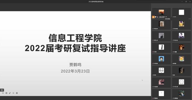 为提高学生考研质量和考研成功率,帮助考研学生解决疫情防控期间复试准备过程中遇到的问题和困难提升考研学生复试技巧3月23日晚,我院举办了2022届考研复试指导培训讲座,讲座通过企业微信会议线上举行