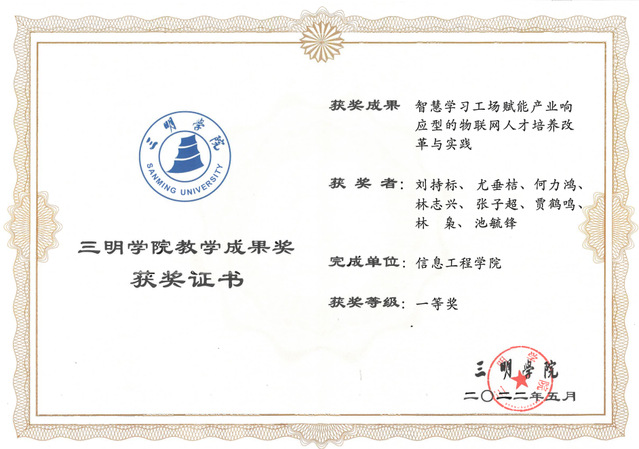根据《我校教学成果奖评选奖励办法》,学校组织开展第七届校级教学成果奖评选工作。经校内形式审查、校外专家评审、校学术委员会审议,评选出第七届校级教学成果奖15项,其中我院《智慧学习工场赋能产业响应型的物联网人才培养改革与实践》获评一等奖。