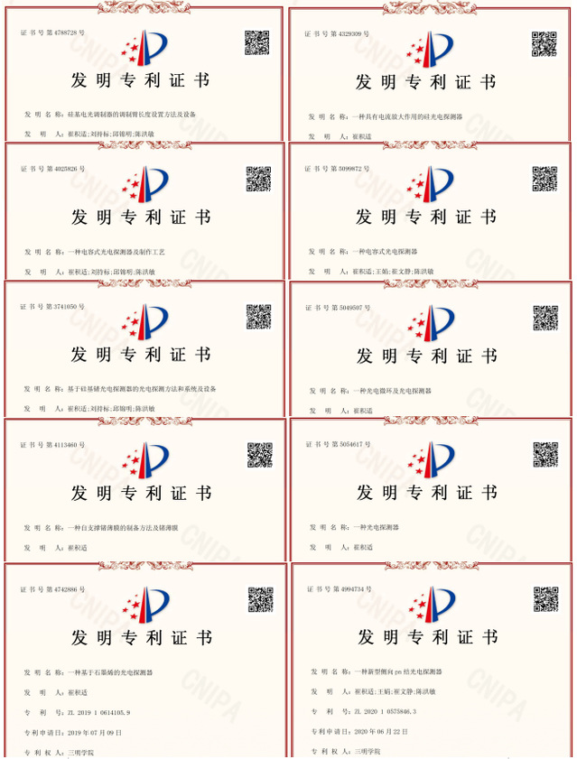 在当前价值观念日趋多元化的社会中,作为名校毕业的高学历人才,崔积适博士始终保持着清醒的思考和选择。硅基光电子技术是将高速电信号转换为光信号并进行传输的技术,具有集成度高、工艺成熟、可靠性好、成本低等一系列优点,目前已经初步投入商用。此外,面向5G光通信、光计算、无人驾驶、生物传感等领域的应用也如火如荼开展。基于上述应用,崔积适博士发挥专业特长,组建科研团队,聚焦制约硅基光电子集成芯片性能进一步提升的瓶颈问题,开展系列研究并取得一定成绩。2019年,崔积适博士与华为技术有限公司联合申请的“Optical waveguide detector and optical module”专利获美国专利授权,标志着我校与国内顶尖科技企业开展实质性科研合作,并取得了突破性成果。入职我校以来,崔积适博士主持国家重点实验开放基金2项、福建省自然科学基金面上项目1项、教育部协同育人项目1项、福建省教育厅中青年项目1项、我校国家自然基金培育项目1项等;以第一作者发表SCI论文4篇,另1篇已返回审稿意见;以第一发明人或唯一发明人申请国家发明专利33项,已授权发明专利10项。