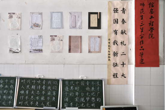 彩纸白墙,翰墨书香。一幅幅书法作品的悬挂展出,表达了对新征程道路的无限希望与对数学师范学子专业技能的充分肯定。此次活动依托支部党建平台、联动支部党员,以“青春献礼二十大,强国有我新征程”为主题,传承闽师精神、提振教育情怀、弘扬课改新理念,展示数学师范的翰墨书香。