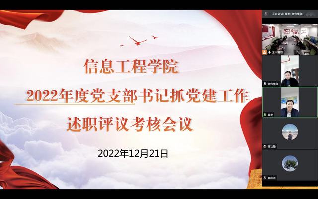 20221221下午信息工程学召开2022年度党支部书记抓党建工作述职评议考核会议,校党委吴龙副校长、组织部、9001cc金沙以诚为本党委委员、各党支部书记、党员代表共20余人参加会议。